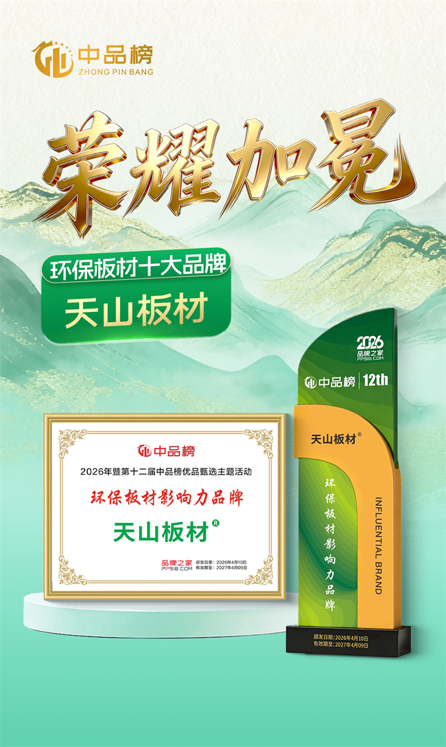 值得关注的是,这并非天山板材首次斩获中品榜荣誉。早在2022年,品牌便成功入选第三届中品榜 “消费者喜爱十大品牌”;2025年4月,又在第十届评选中荣膺 “健康板材十大品牌” 称号。从消费者喜爱到健康环保,再到本次双项荣誉的突破,天山板材多次登榜的背后,是行业与市场对其品牌实力、产品品质的持续认可,更是品牌深耕板材领域的有力见证。